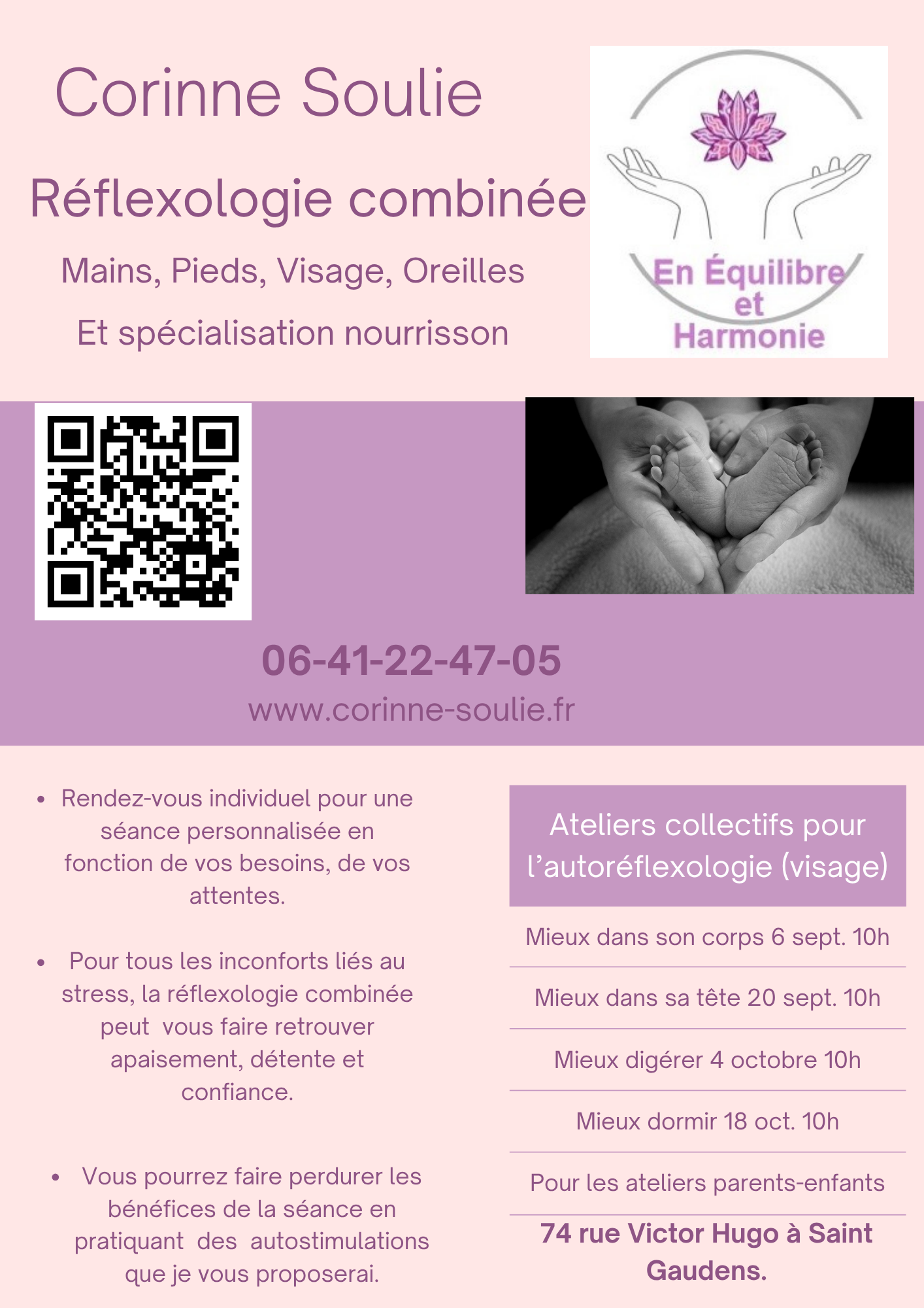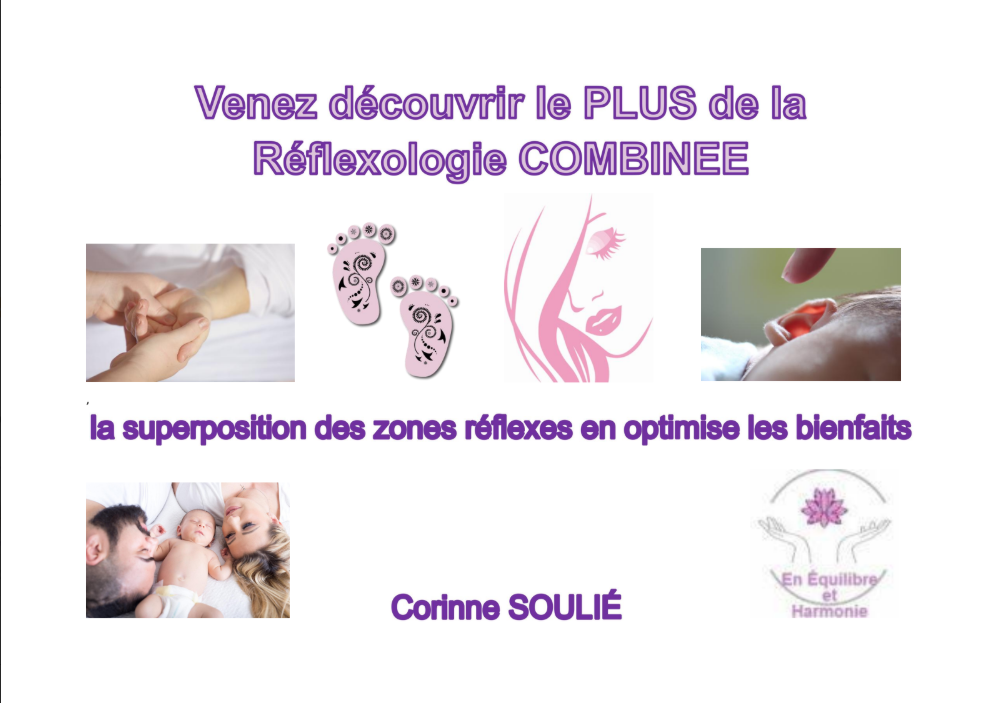 La réflexologie combinée permet de se détendre, de s'apaiser, de retrouver un équilibre émotionnel. La stimulation des zones réflexes au niveau des mains, des pieds, du visage et des oreilles est adaptée à tous, dès la naissance.
